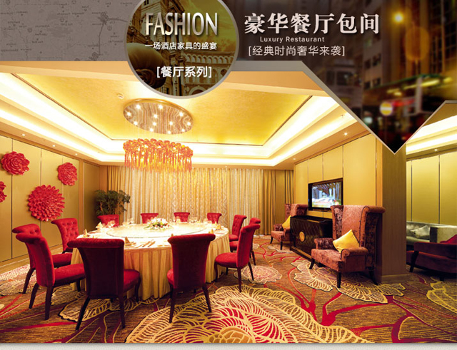 產(chǎn)品簡(jiǎn)介:酒店家具豪華餐廳包間,餐廳包間桌椅組合,專(zhuān)業(yè)定制各種豪華酒店家具,精裝豪宅家具等并提供裝飾設(shè)計(jì)。