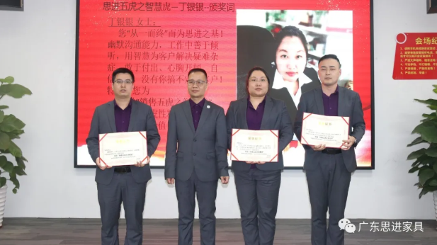 ?思進(jìn)品牌總經(jīng)理戴金榮為三位“銷(xiāo)售虎將”—馬春水(左一)、丁銀銀·(右二)、褚千里(出差中,同事代領(lǐng))頒發(fā)證書(shū)