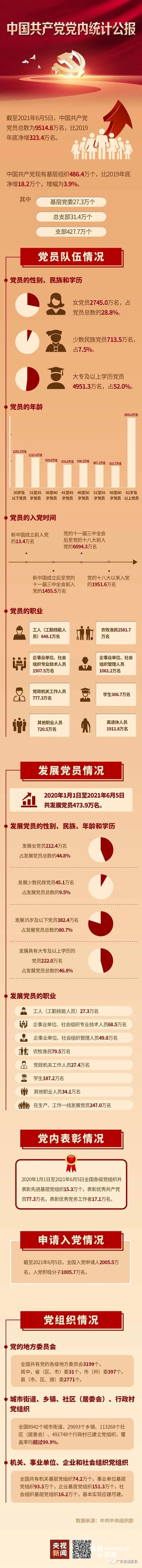 新華社北京6月30日電中央組織部最新黨內(nèi)統(tǒng)計(jì)數(shù)據(jù)顯示,截至2021年6月5日,中國共產(chǎn)黨黨員總數(shù)為9514.8萬名,黨的基層組織總數(shù)為486.4萬個(gè)。歷經(jīng)百年風(fēng)雨,中國共產(chǎn)黨從小到大、由弱到強(qiáng),從建黨時(shí)50多名黨員,發(fā)展成為今天已經(jīng)擁有9500多萬名黨員、在14億多人口的大國長期執(zhí)政的黨。